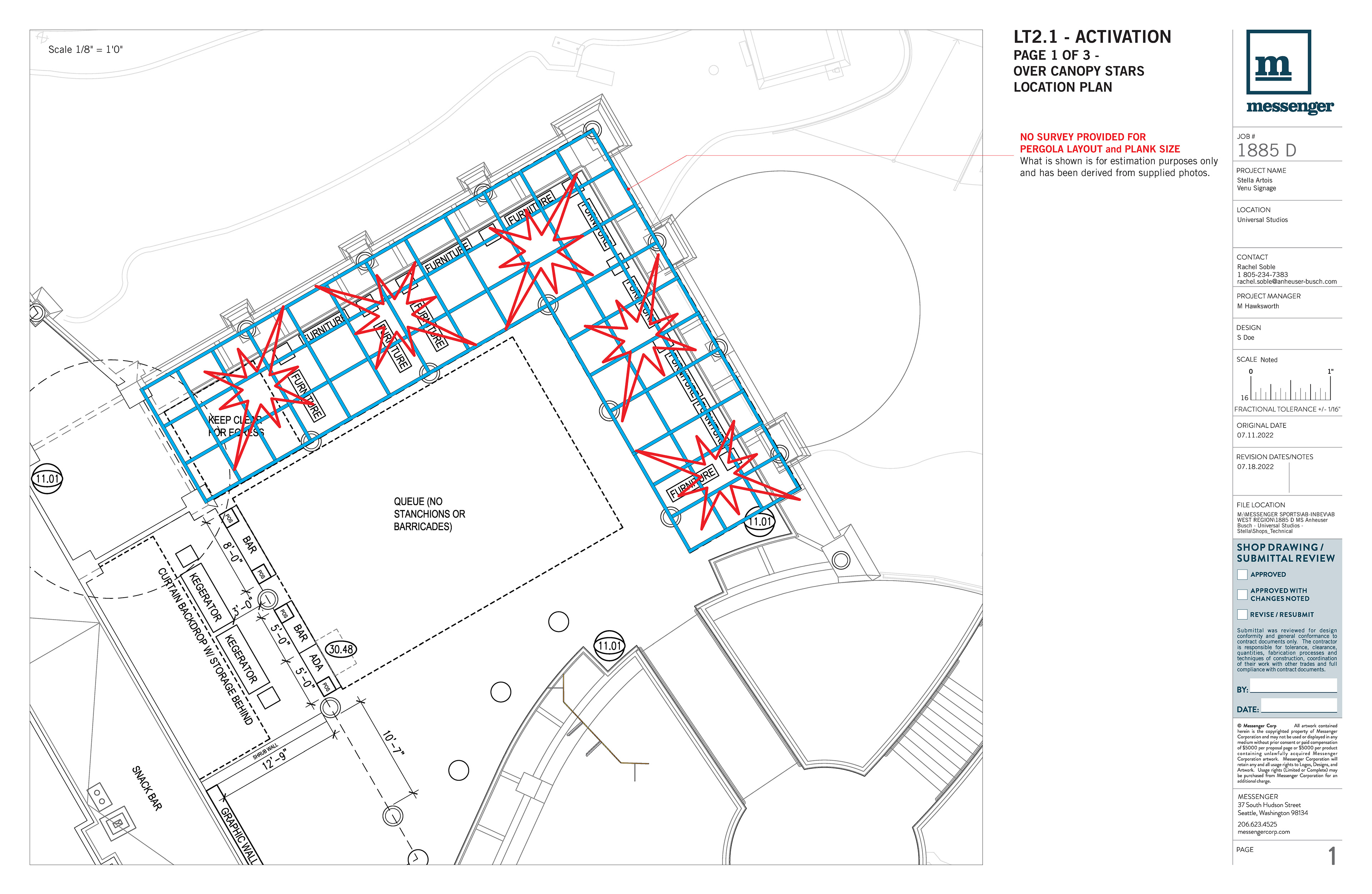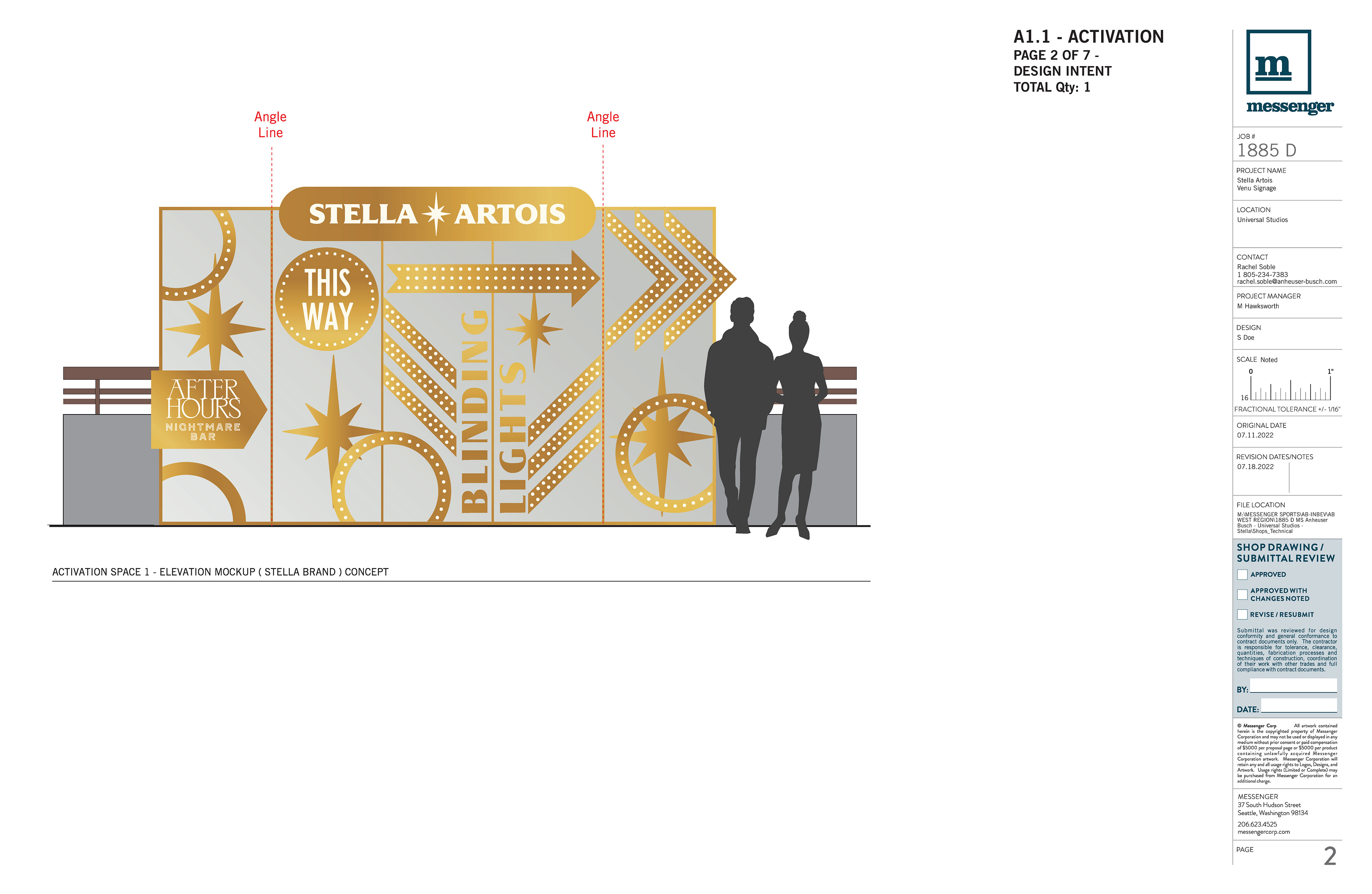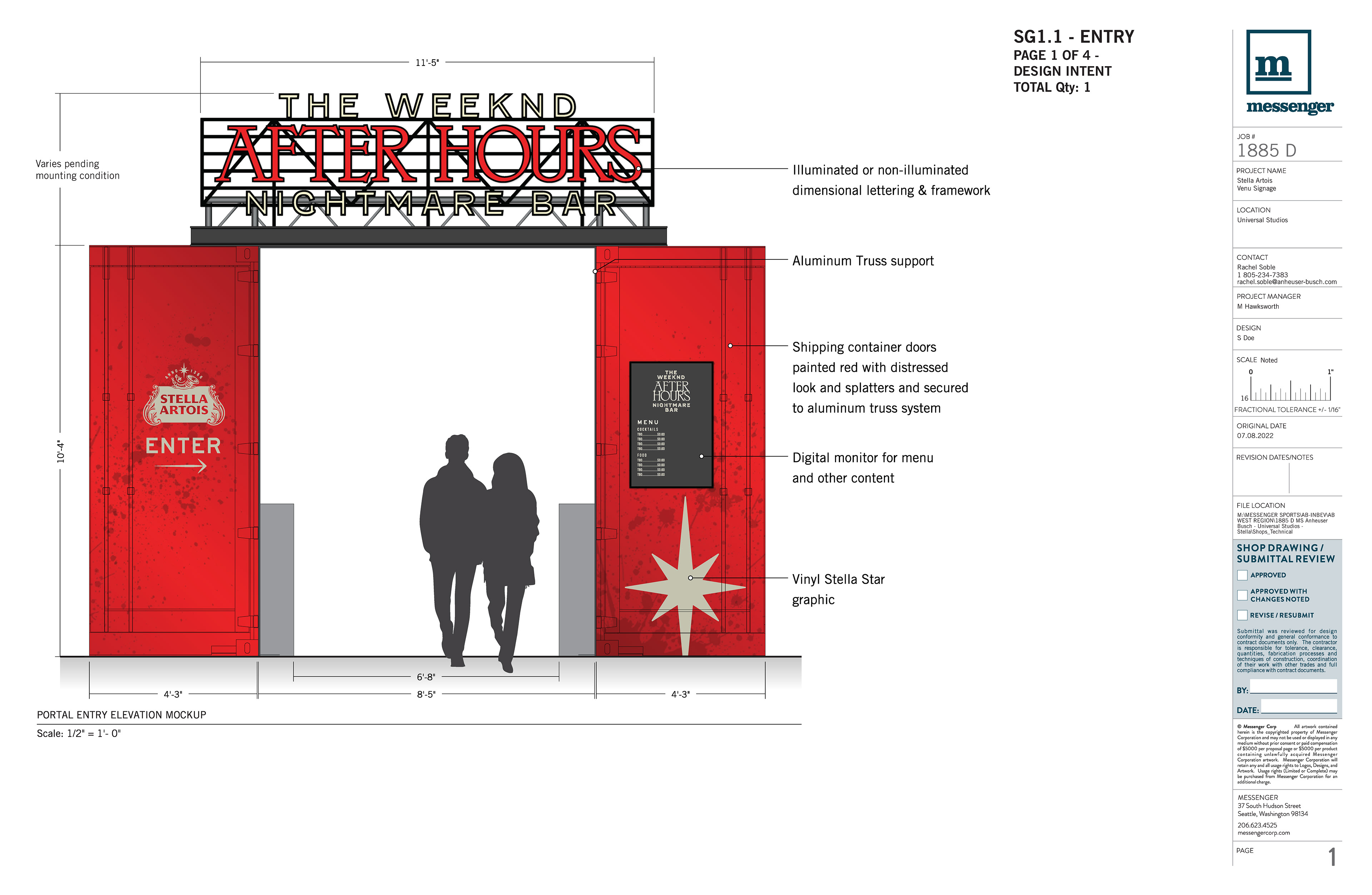 This project, like so many, was a quick turn on a limited budget with high impact. My job: take the rather flat and unrealized concepts and make them work. I considered safety with regard to mounting actual shipping container doors, the dimensionality of the mirror wall where there was none, and a method to attach and enhance faux neon Stella Artois burst logo fixtures. It looks like it was a spectacular party!