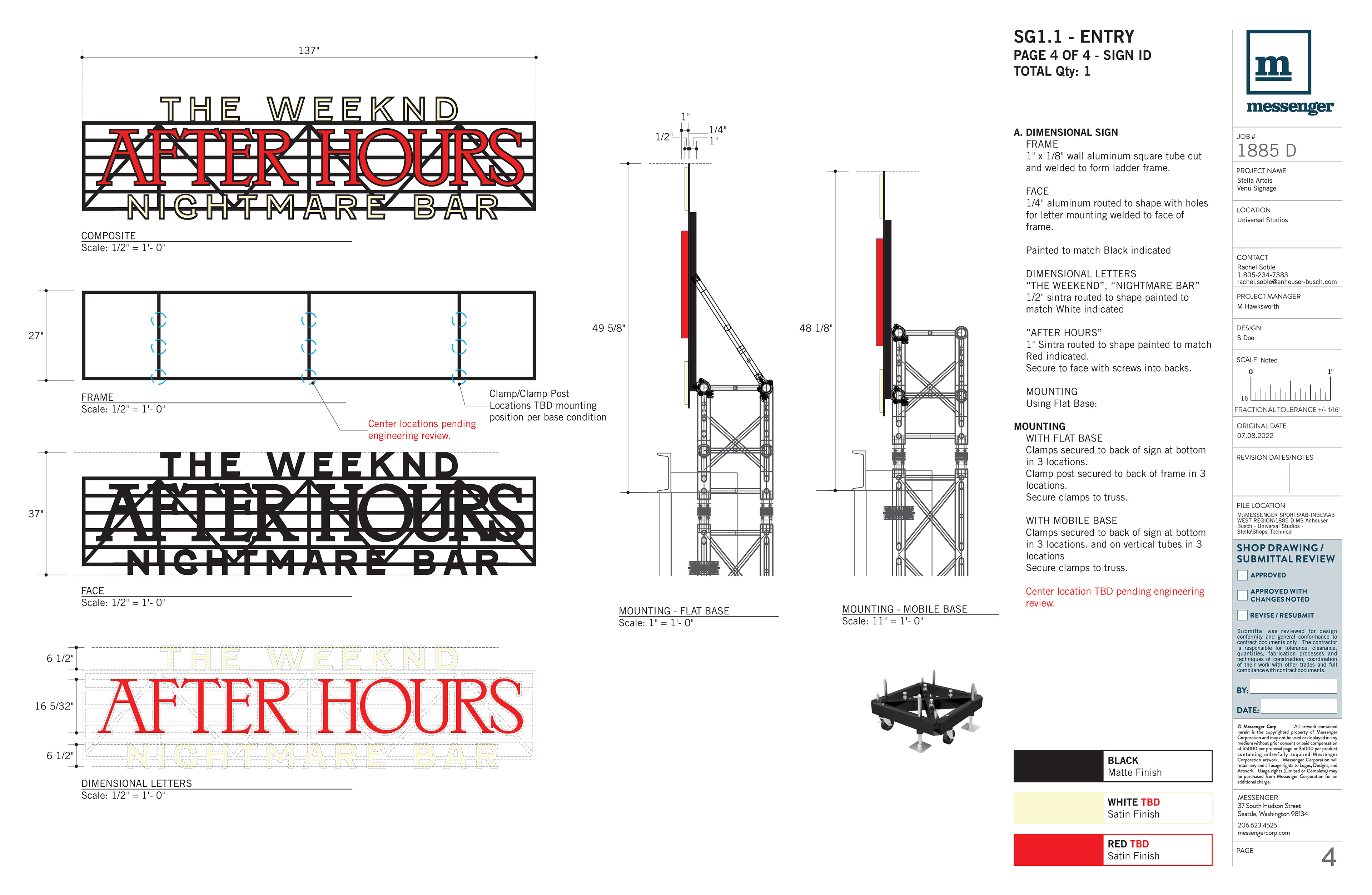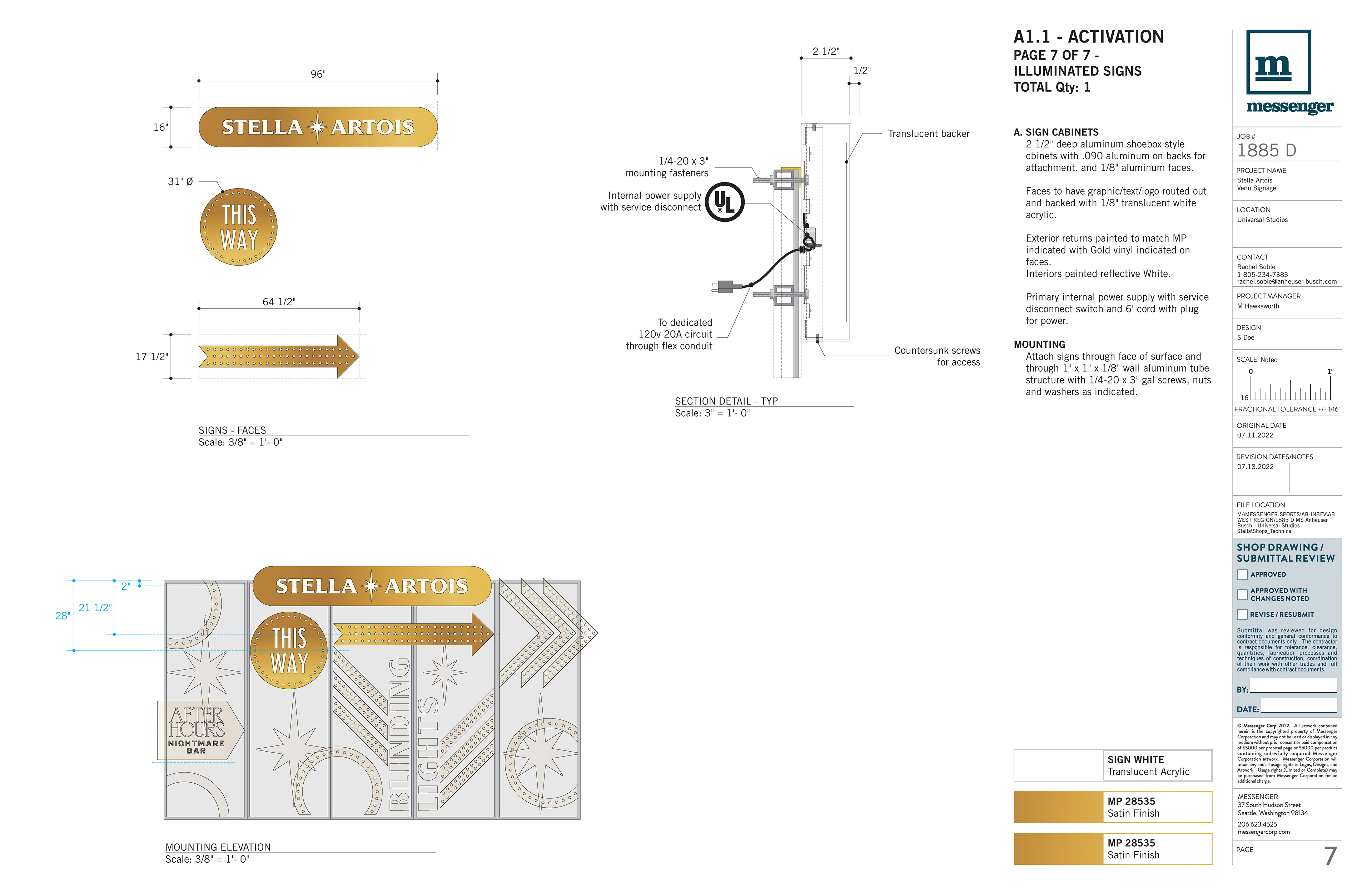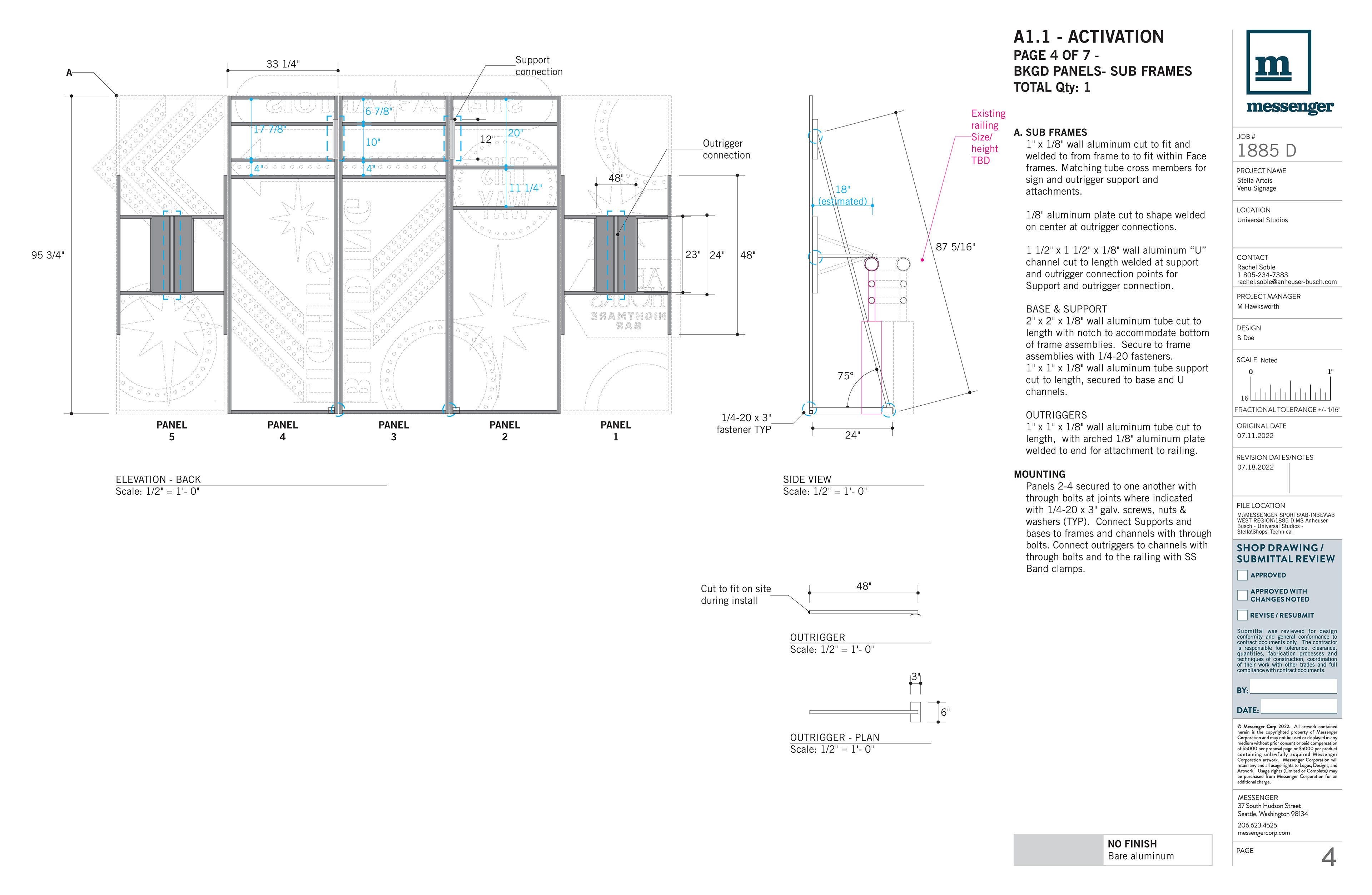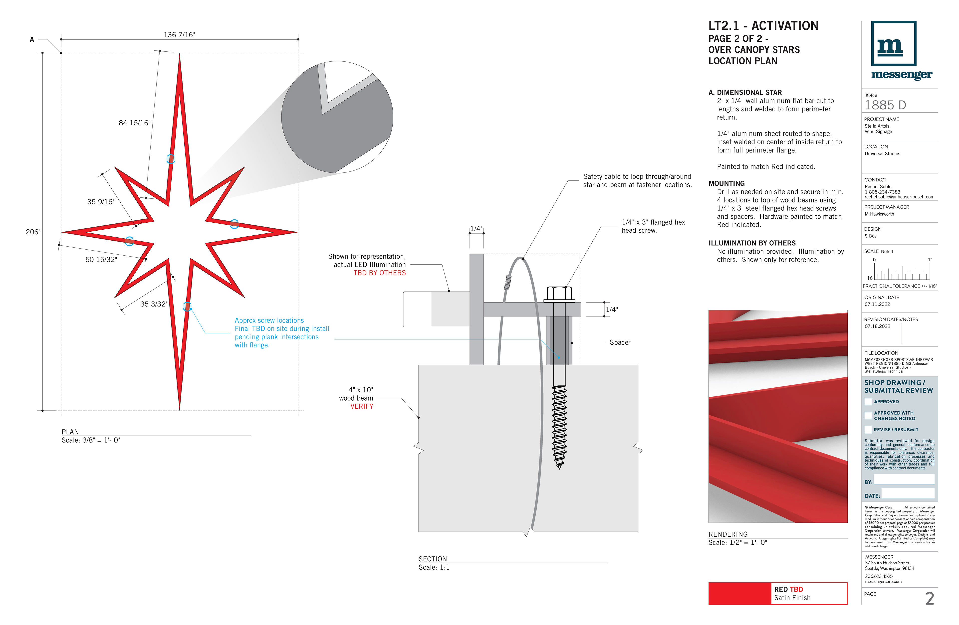Direction of technical build design with fabrication specifications, including materials, attachment methods, and electrical.